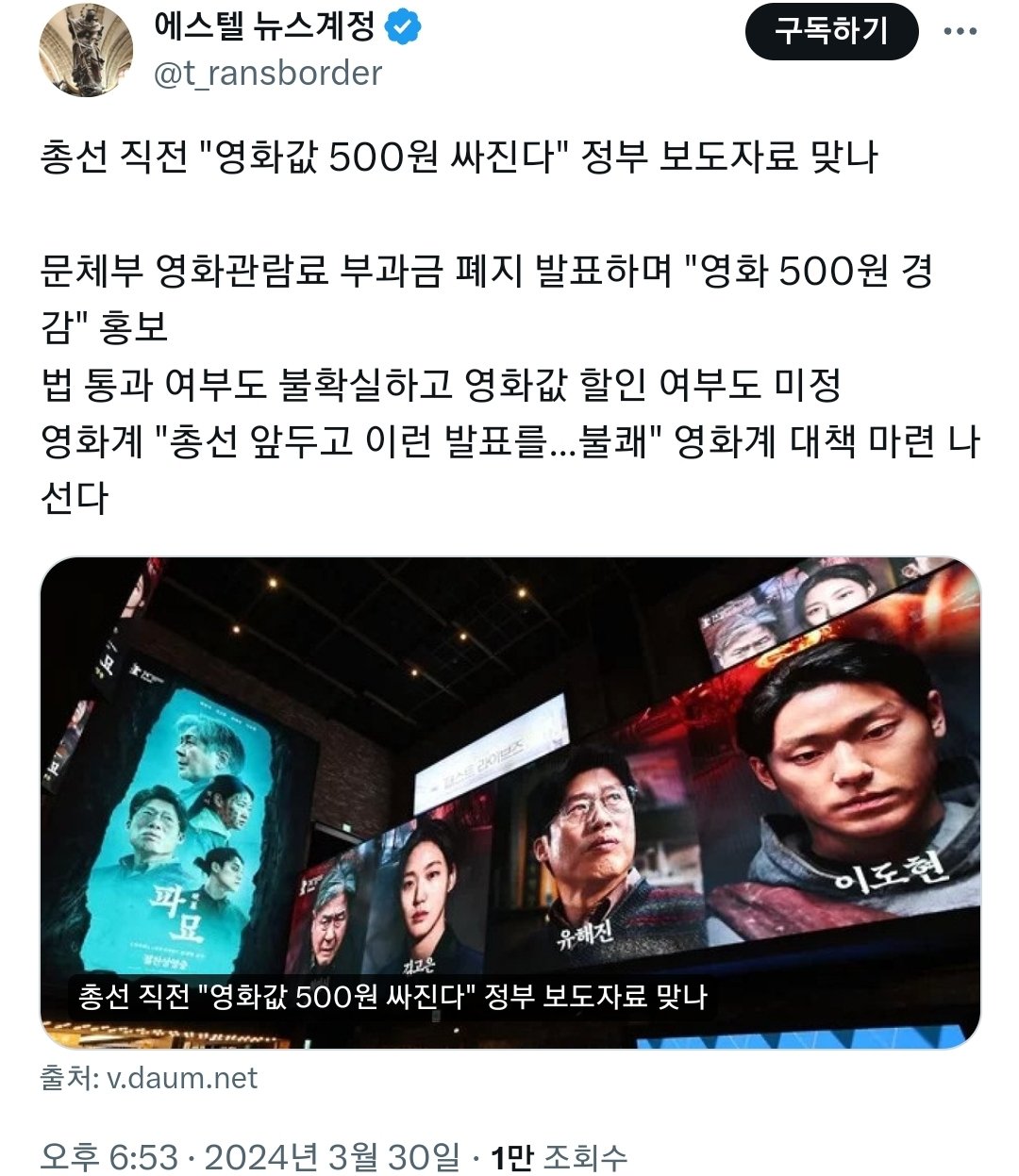 영화표 500원 싸진다고 발표했던 문체부 근황