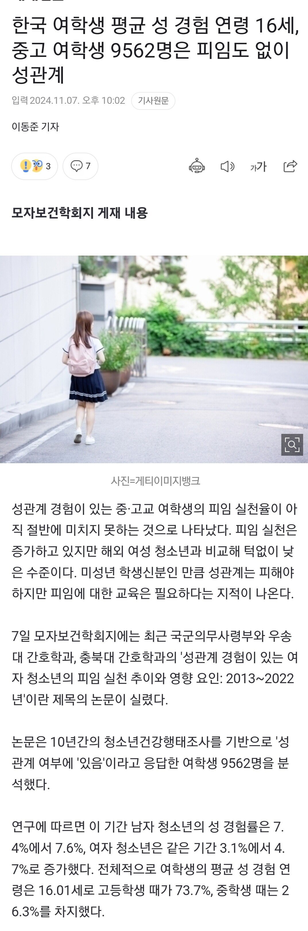 한국 여학생의 성경험 연령 16세.news