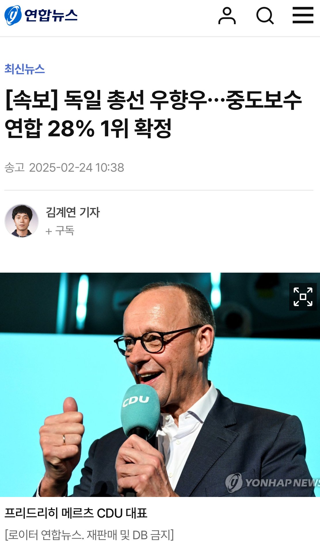 [속보] 독일 총선 우향우 중도보수 연합 28프로 1위 확정