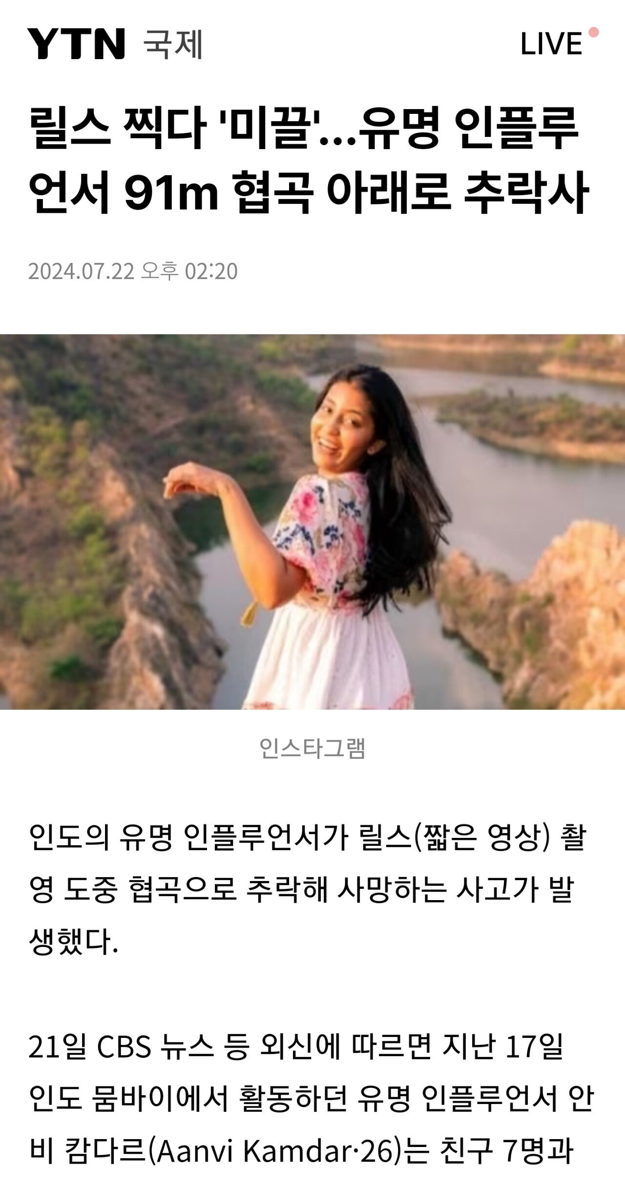 인도 인플루언서 인생샷 찍으려다 91m 아래로 추락사