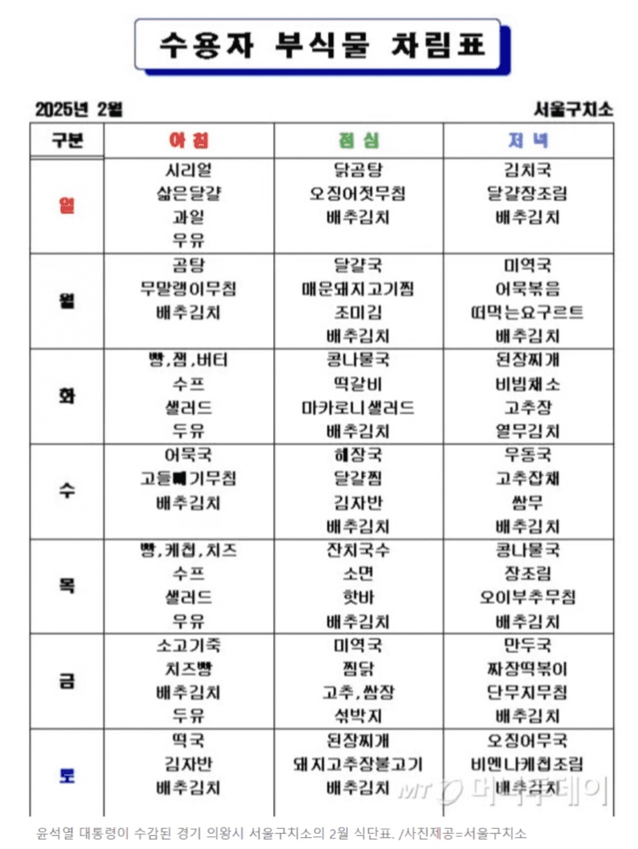 이번달 서울 구치소 급식메뉴