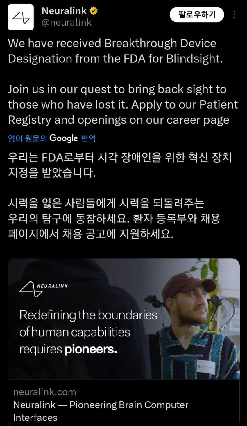 뉴럴링크: 시각장애인 대상의 임상실험 FDA 승인받음