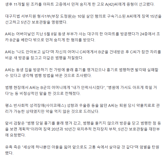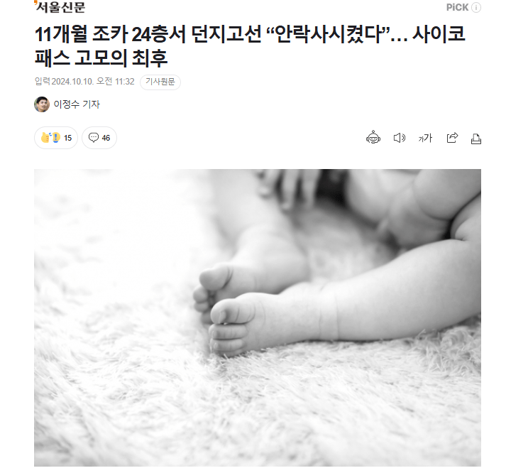 11개월 조카 24층서 던지고선 “안락사시켰다”… 사이코패스 고모의 최후