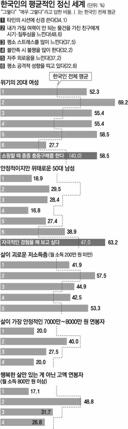 이런 성향은 높은 스트레스와 잦은 짜증(불평, 불만)으로 이어질 개연성을 내포한다. 스트레스 정도는 불확실한 미래, 청년실업, 스펙 쌓기 등 과도한 경쟁 등으로 인해 20대(46.2%)에서 가장 높았다. 20대 여성(55.4%)의 스트레스 정도가 가장 높았다. 반면 50대 남성(28.4%)은 가장 스트레스를 덜 받는 집단이었다. 50대 남성은 29.5%만 시기·질투심을 느낀다고 응답했다.