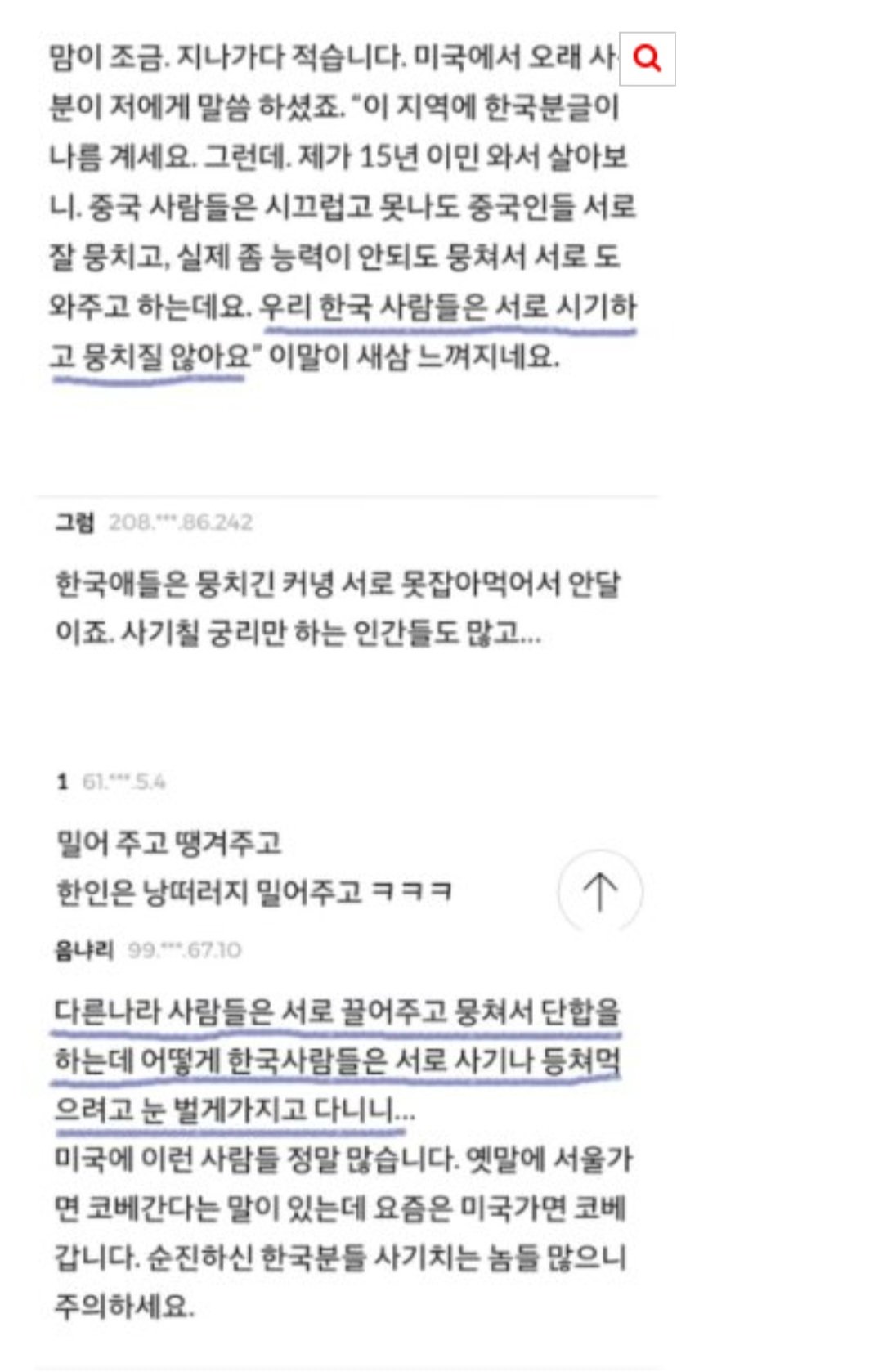 한국인들은 일찍부터 사교육과 입시 경쟁에 내몰리면서 경쟁을 먼저 배우고, 이런 분위기에 익숙해진 사람들은 항상 자신과 남을 비교하고, 그 과정에서 시기·질투심에 사로잡힌다.