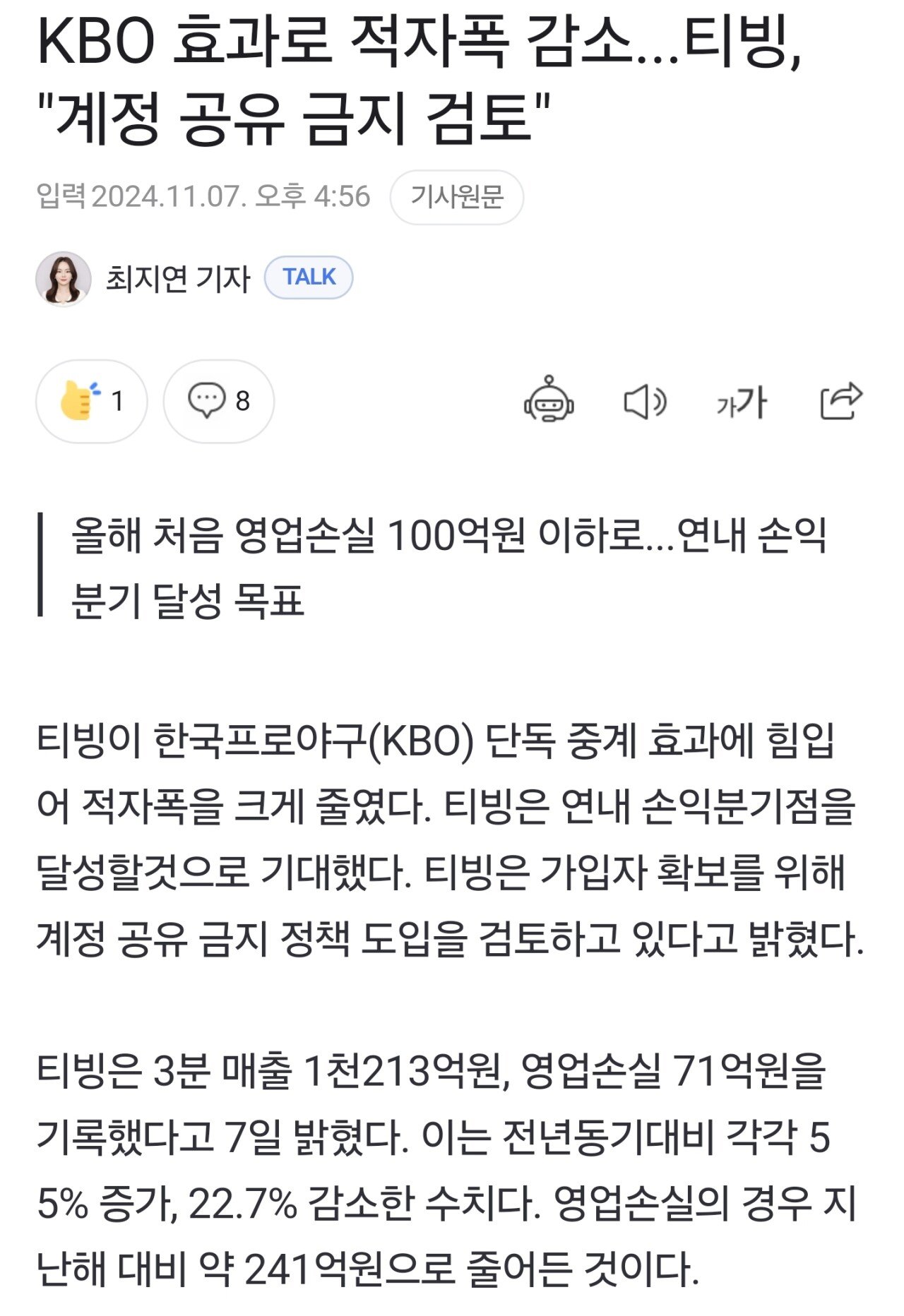 KBO 효과로 적자폭 감소...티빙, "계정 공유 금지 검토"