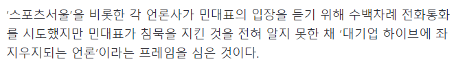 ‘스포츠서울’을 비롯한 각 언론사가 민대표의 입장을 듣기 위해 수백차례 전화통화를 시도했지만 민대표가 침묵을 지킨 것을 전혀 알지 못한 채 ‘대기업 하이브에 좌지우지되는 언론’이라는 프레임을 심은 것이다.