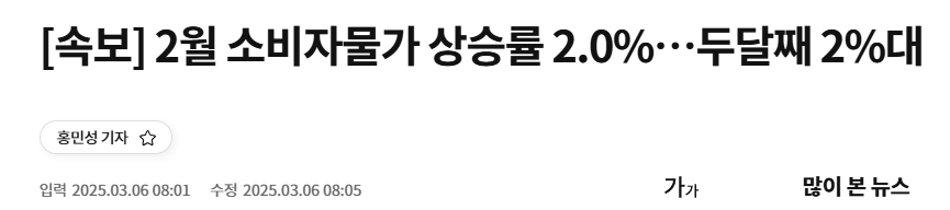 [속보] 2월 소비자물가 상승률 2.0%…두달째 2%대