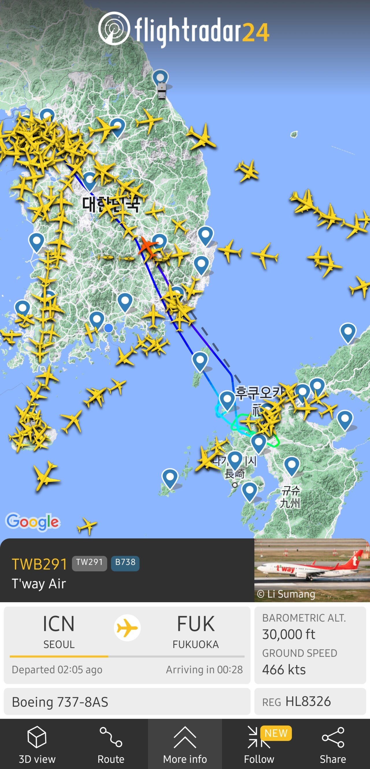<실시간> 후쿠오카 공항 착륙 포기하고 인천으로 회항중인 티웨이 항공 비행기 ㄷㄷㄷ.jpg