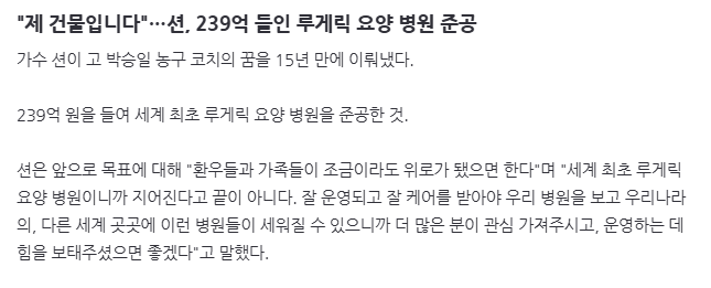"제 건물입니다"…션, 239억 들인 루게릭 요양 병원 준공