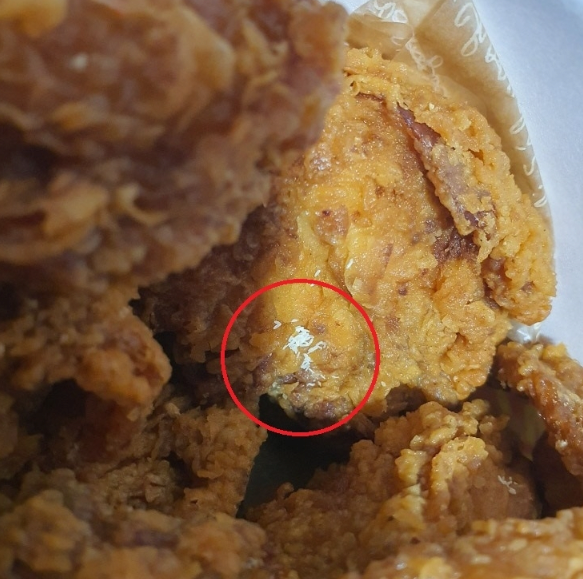 한 대형마트에서 판매한 프라이드치킨에서 살아 있는 파리와 파리알로 추정되는 물질이 발견됐습니다.