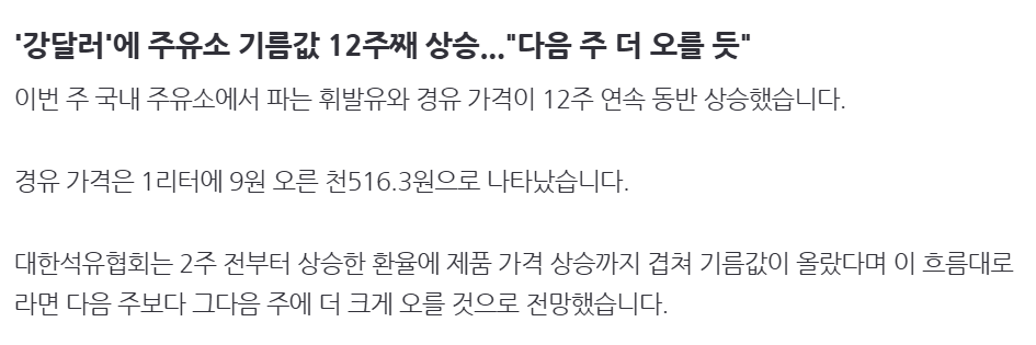 '강달러'에 주유소 기름값 12주째 상승..."다음 주 더 오를 듯"