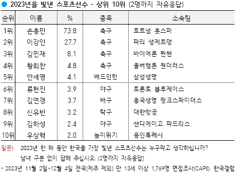 2023년을 빛낸 스포츠 선수 - 상위 10위 (갤럽) 손흥민 ㄷㄷ