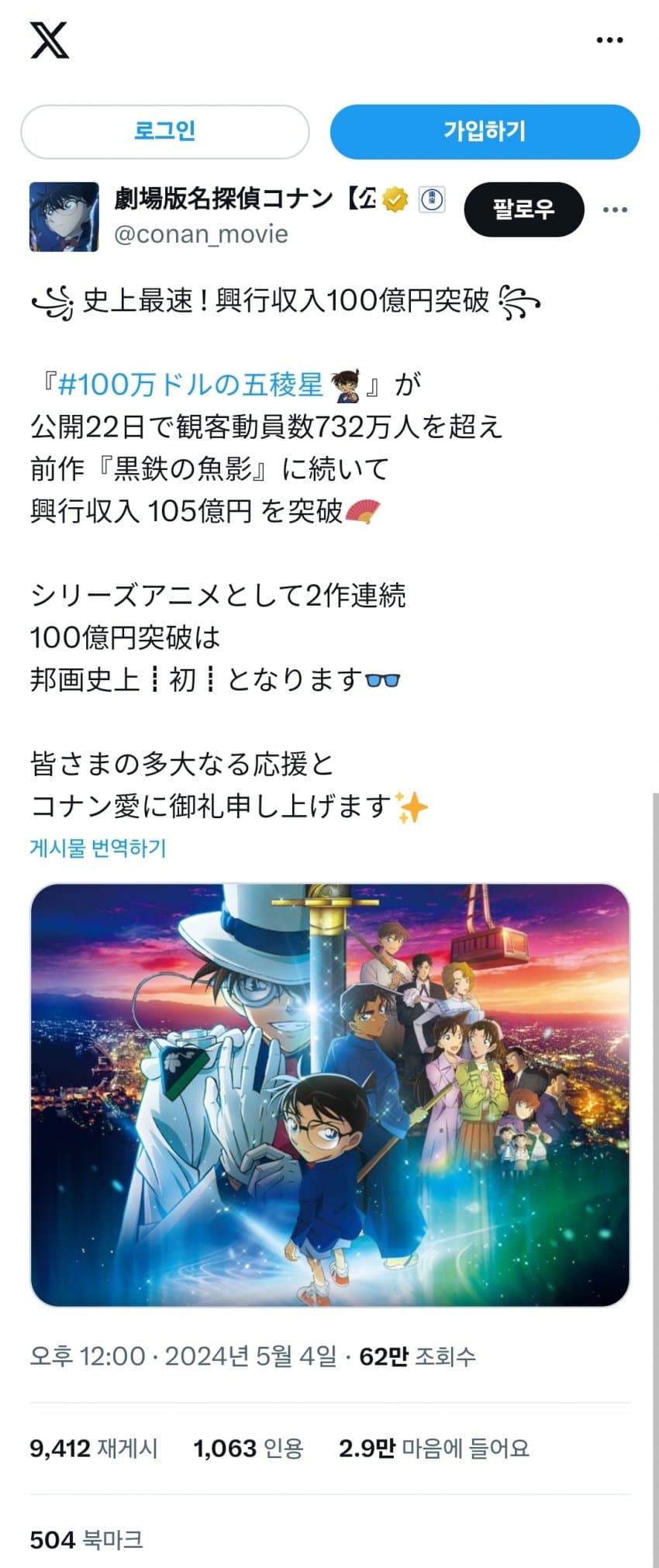'명탐정코난:100만 달러의 펜타그램' 100억엔 돌파