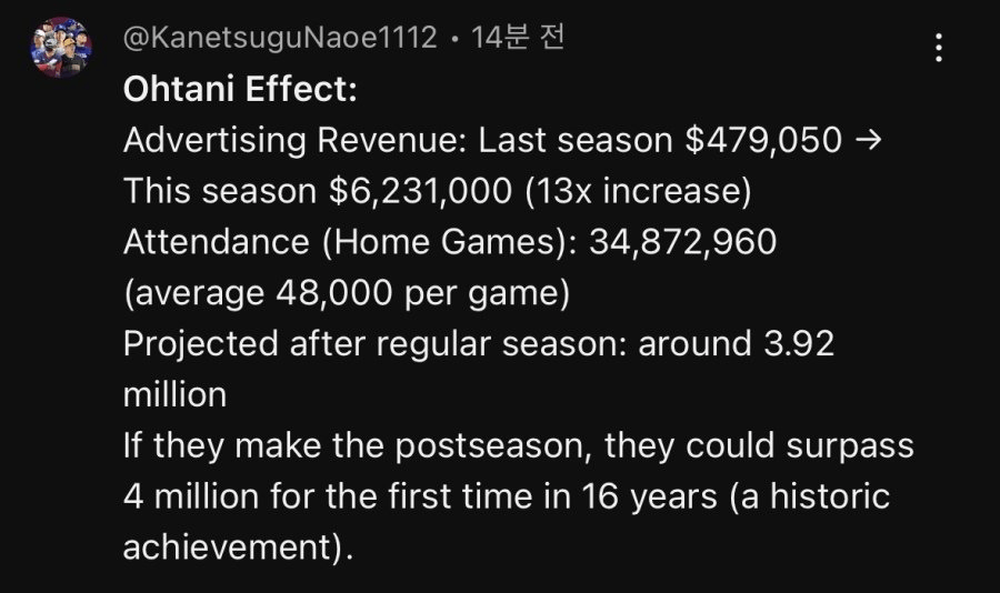 *광고 수익:*- 지난 시즌: $479,050- 이번 시즌: $6,231,000 (13배 증가)*관중 수 (홈 경기):*- 총계: 34,872,960 (게임당 평균 48,000)- 정규시즌 이후 예상 : 약 392만명*포스트시즌에 미칠 영향:*- 플레이오프에 진출하면 16년 만에 관중 400만 명을 돌파하는 역사적인 성과를 기록할 수 있음.