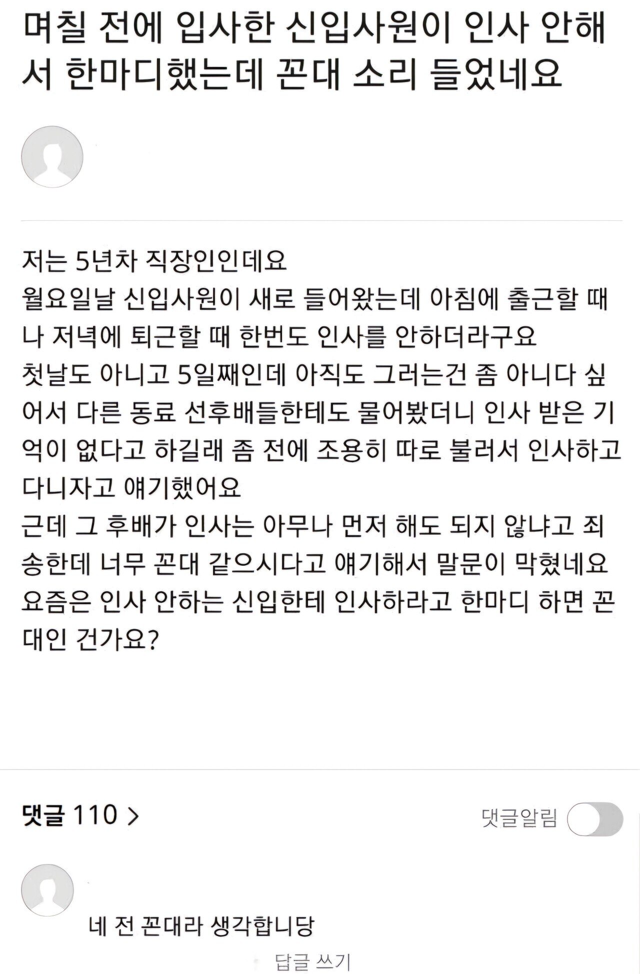 신입이 인사 안해서 뭐라 했더니 꼰대라고 하네요.jpg