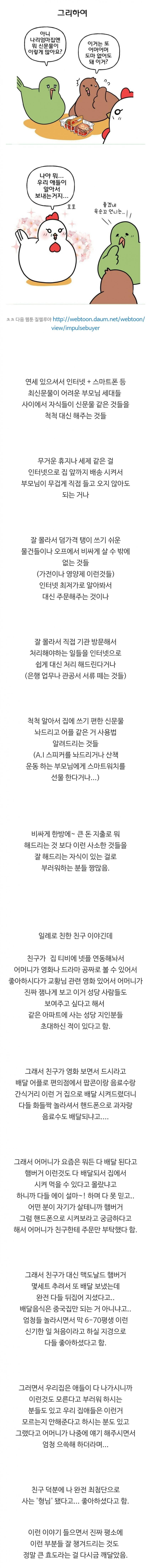 꼭 출세해서 비싼 명품 사드리고 이런 것도 좋지만, 온라인 배달, 주문 등 부모님이 잘못하는거 사소하게 챙겨주는거 좋아한다함