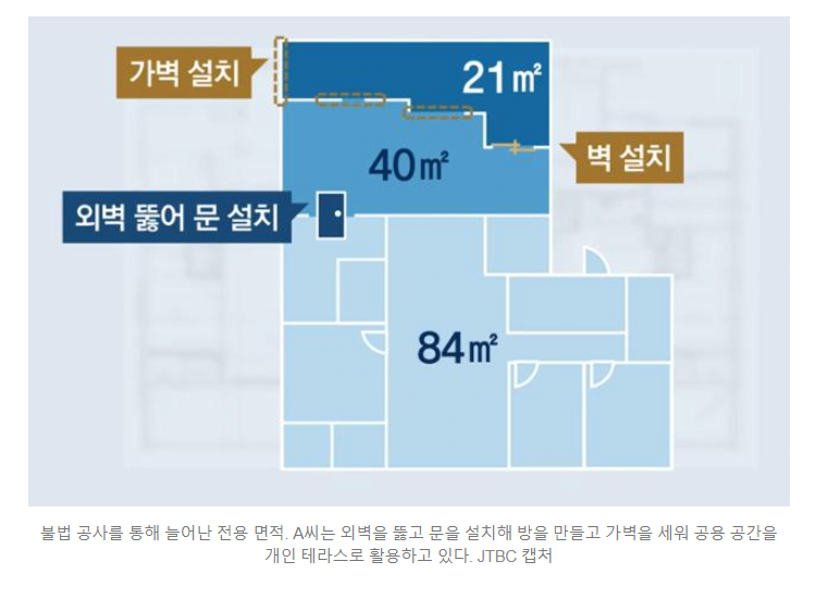 A씨는 거주하는 세대에 임의로 외벽을 뚫어 문을 설치한 뒤 벽을 세워 방 하나를 새로 만들었다. 또 가벽을 세워 외부인의 출입을 막아 공용 공간을 개인 테라스로 활용하고 있다. 84㎡(34평)이던 A씨의 집은 약 40㎡(12평) 크기의 방을 포함해 총 52평까지 늘어난 것으로 파악됐다.