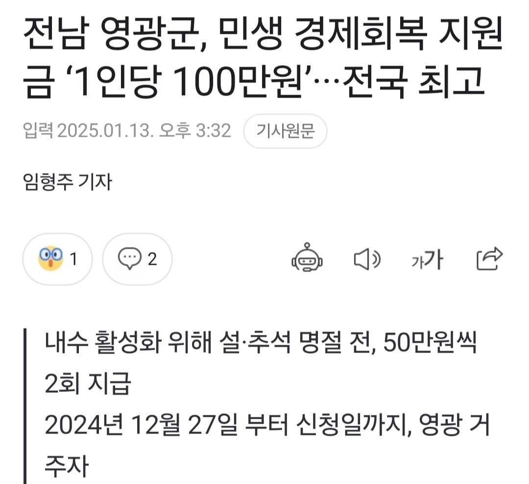 전남 영광군, 명절 지원금 1인당 100만원 지급 전국최고