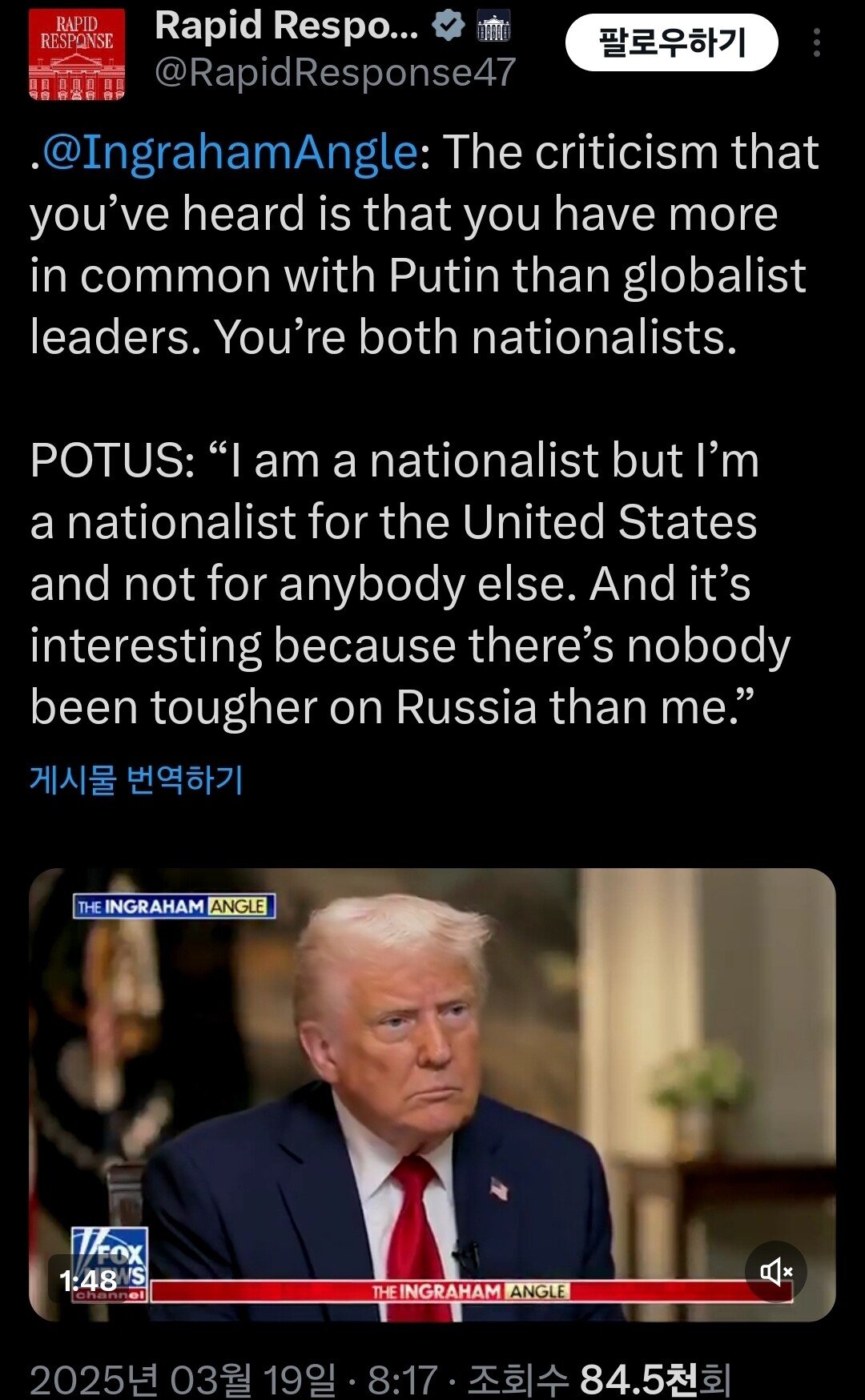 트럼프 "나는 민족주의자다. 나만큼 러시아에 강경한 사람 없어"