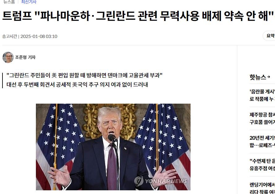 다만 트럼프 당선인은 최근 자신이 고율 관세 부과 구상과 미국으로의 편입 가능성 등을 거론했던 캐나다에 대해서는 군사력이 아닌 "경제적 강압"을 사용할 수 있다고 말했다.