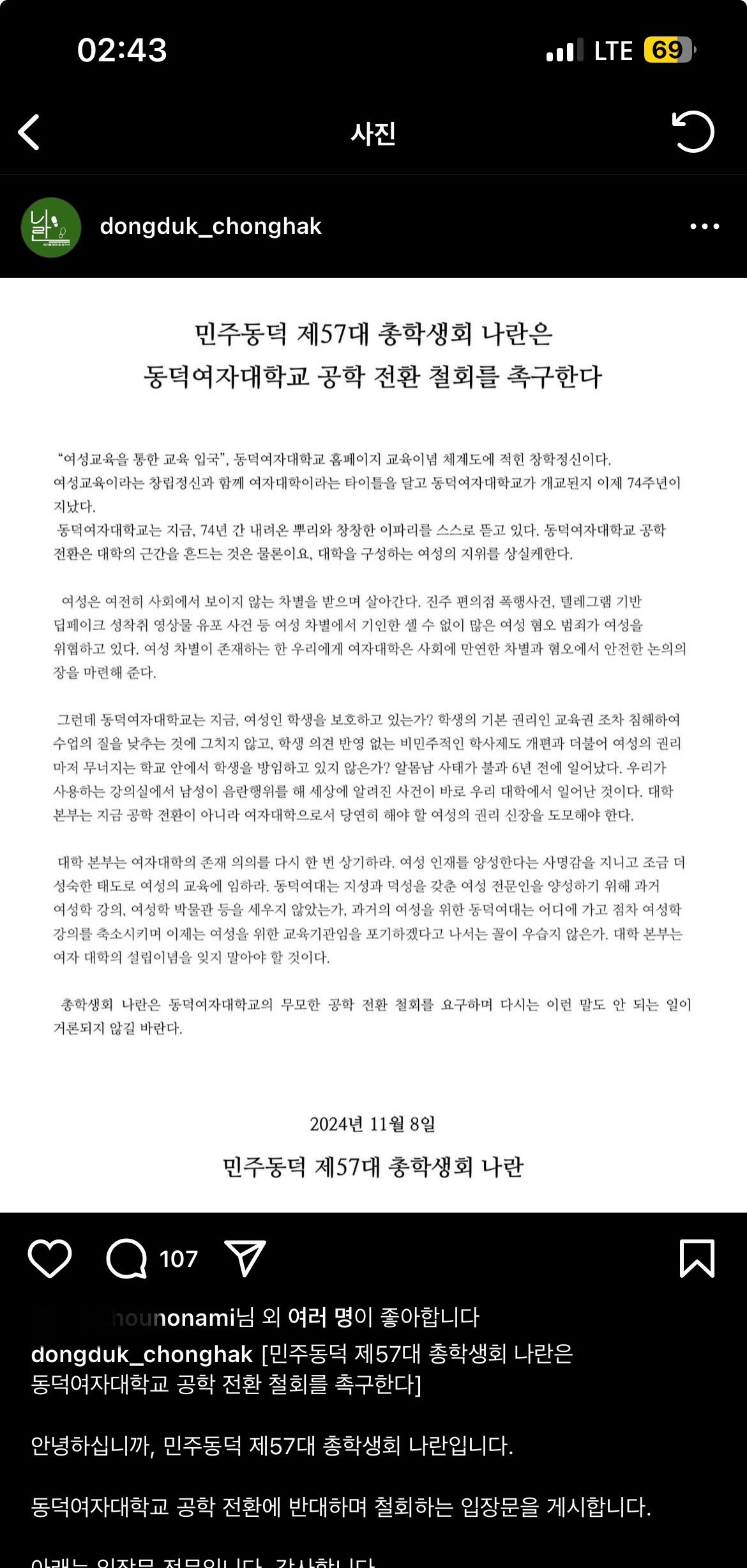 동덕여대 총학이 5일전에 올린 입장문인데