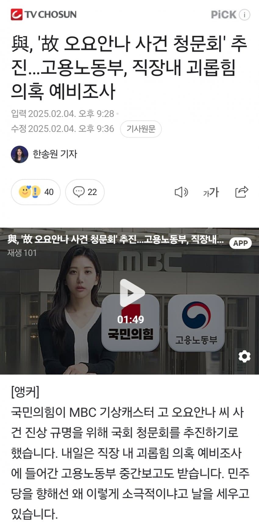 기사) 故 오요안나 사건 청문회 열린다