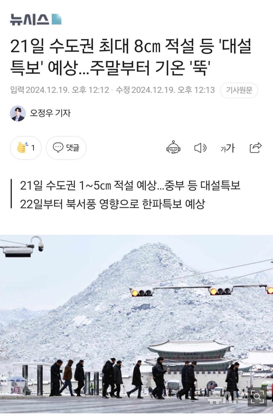 21일 수도권 최대 8cm 적설 등 대설특보 예상 주말부터 기온 뚝