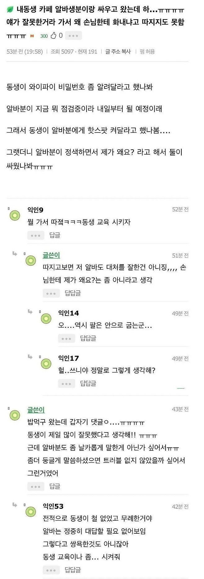 카페 알바가 핫스팟 안 켜줘서 싸운 사람