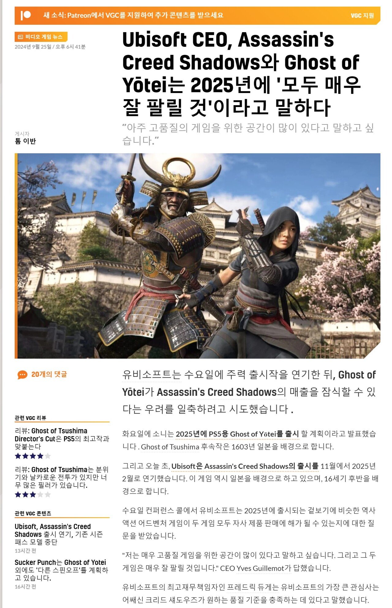 유비CEO, 어크 섀도우와 고스트 오브 요테이 모두 잘 팔릴 것