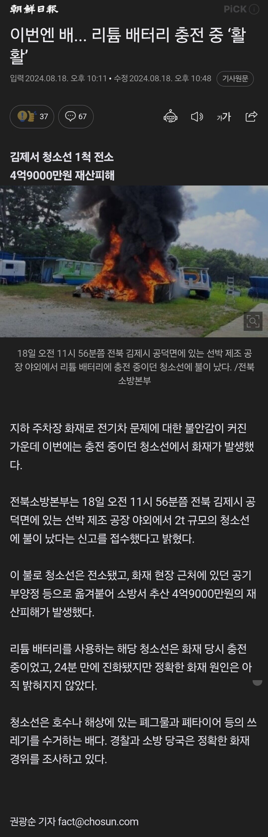 전기차 이어서 이번엔 배..리튬 배터리 충전 중 '활활'