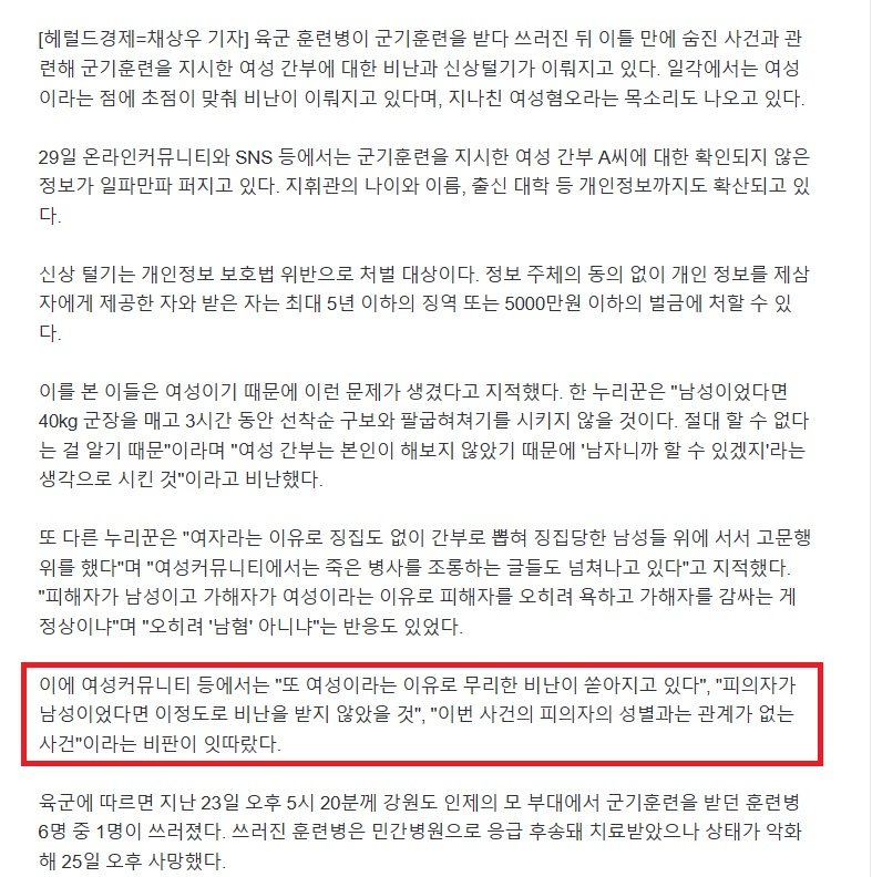 "훈련도 제대로 안해본 여자가"…얼차려 사망 女간부에 '여혐' 논란