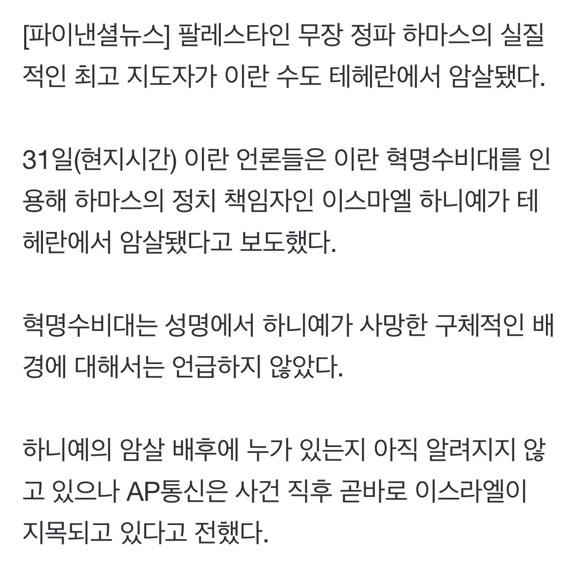 [1보] 이란 방문하던 하마스 최고 지도자 하니예 암살 ㄷㄷㄷㄷㄷ
