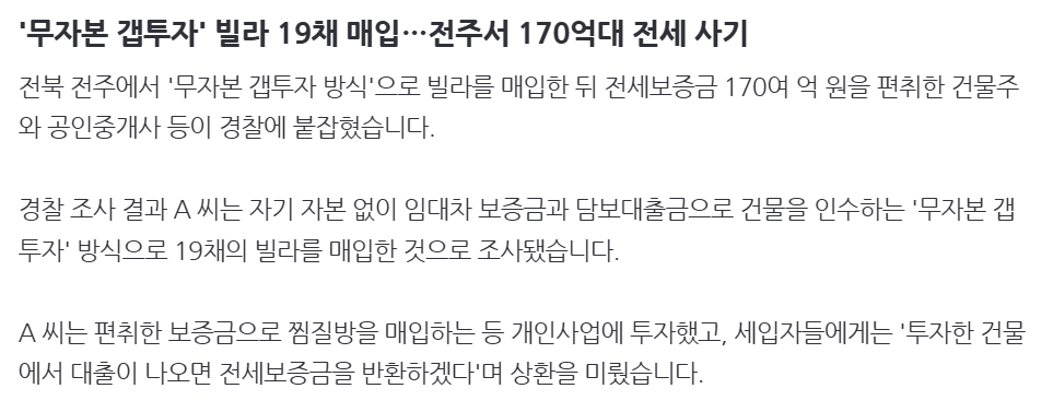 '무자본 갭투자' 빌라 19채 매입…전주서 170억대 전세 사기