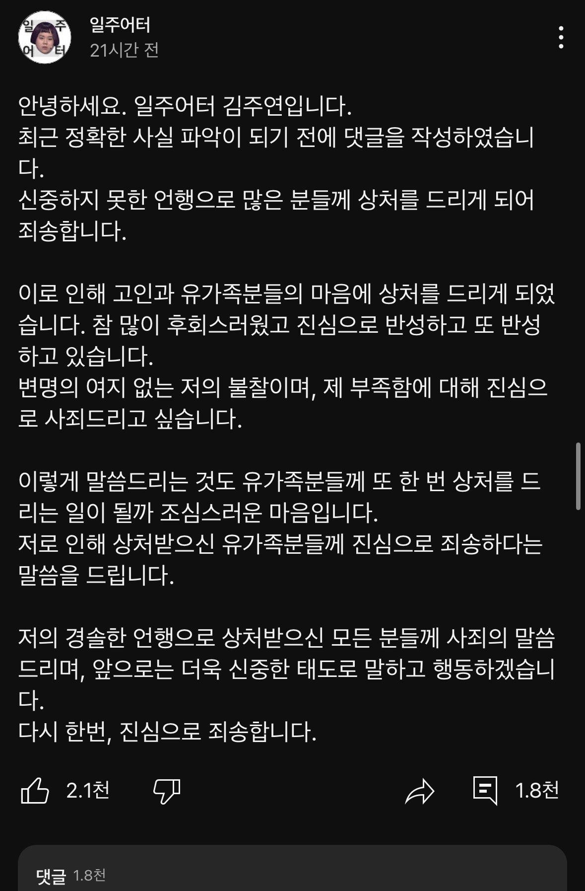 MBC 기상캐스터 옹호 유투버 일주어터 사과문 업로드..youtube