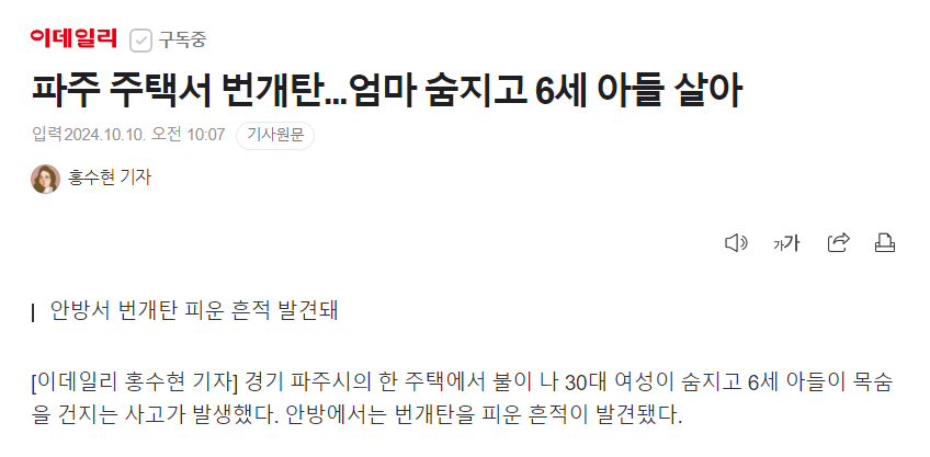이 불로 집 안에 있던 30대 여성 A씨가 숨졌다. 한밤중 연기가 나는 것을 발견하고 이웃이 문을 두드리자 집 안에 있던 A씨의 6세 아들은 밖으로 무사히 대피해 목숨을 구했다.
