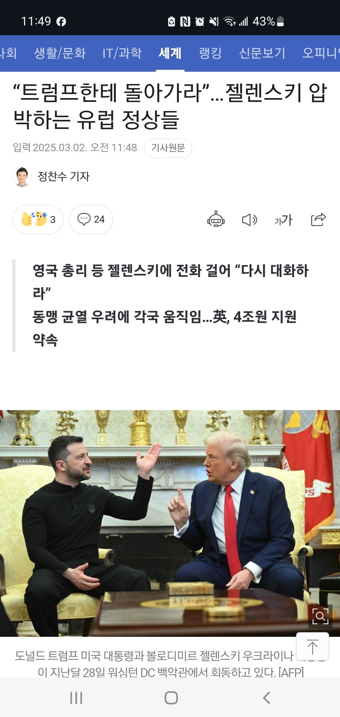 볼로디미르 젤렌스키 우크라이나 대통령이 도널드 트럼프 미국 대통령과 회담을 파행으로 끝내자, 유럽 정상들이 젤렌스키 대통령을 압박하고 나섰다.1일(현지시간) 영국 텔레그래프에 따르면 전날 백악관에서 생중계된 트럼프 대통령과 젤렌스키 대통령의 회담이 설전 속에 끝난 이후 키어 스타머 영국 총리는 젤렌스키 대통령에게 전화를 걸어 백악관으로 돌아가라고 설득했다.