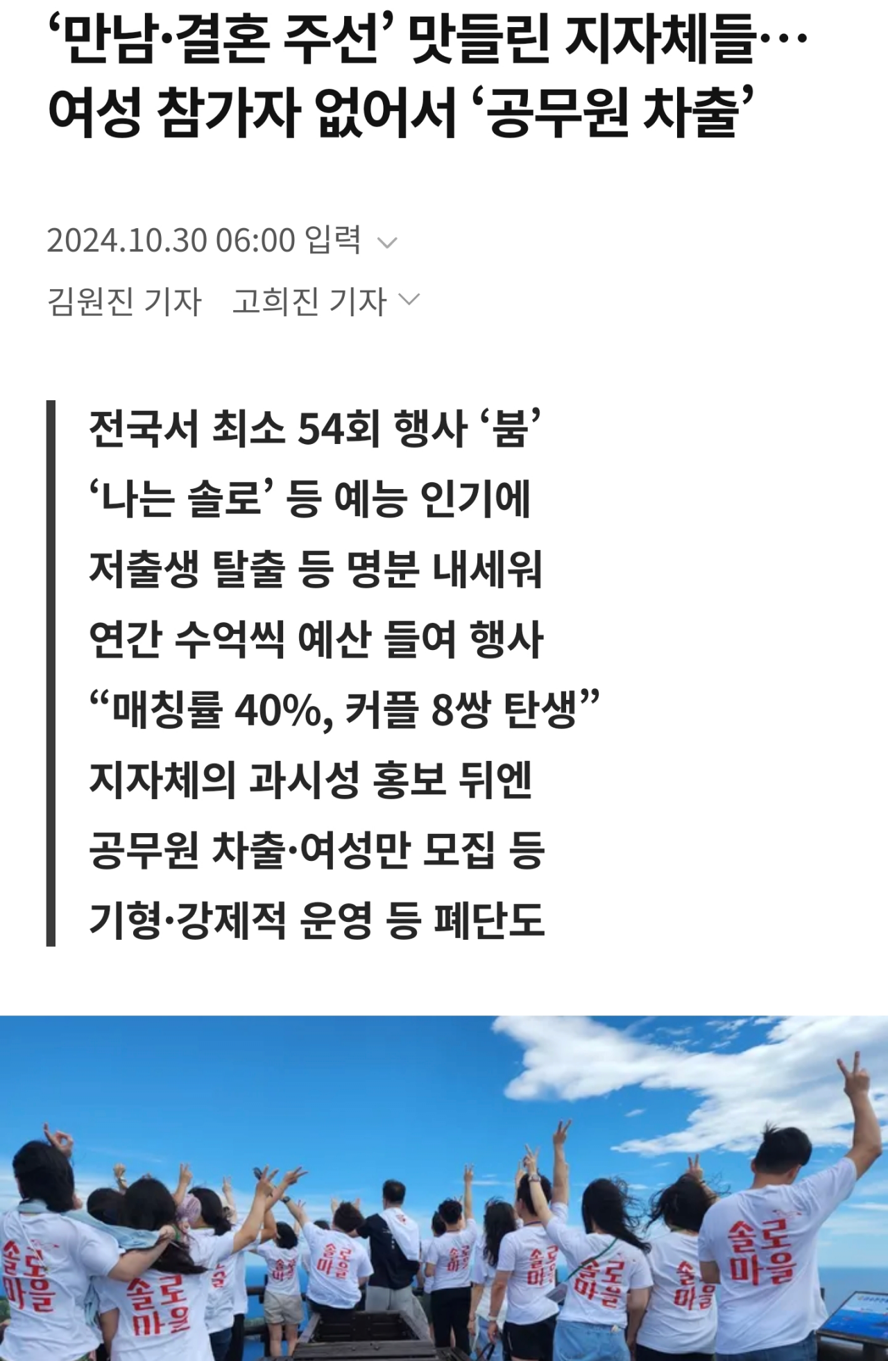 ‘만남·결혼 주선’ 맛들린 지자체들…여성 참가자 없어서 ‘공무원 차출’