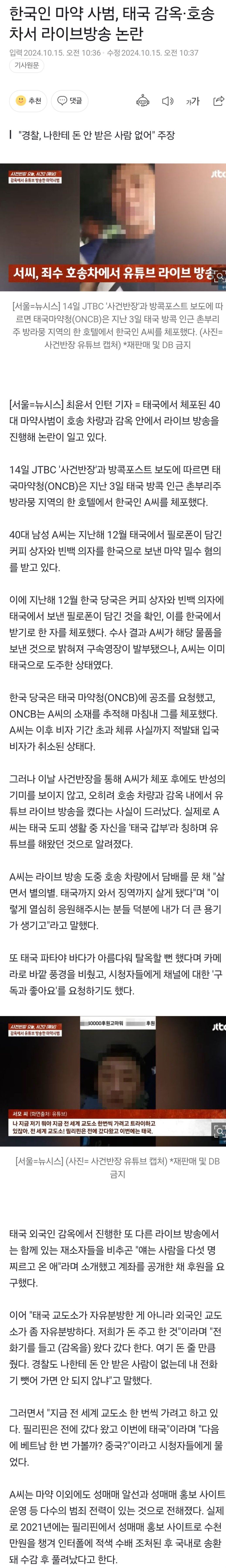 한국인 마약 사범, 태국 감옥·호송차서 라이브방송 논란