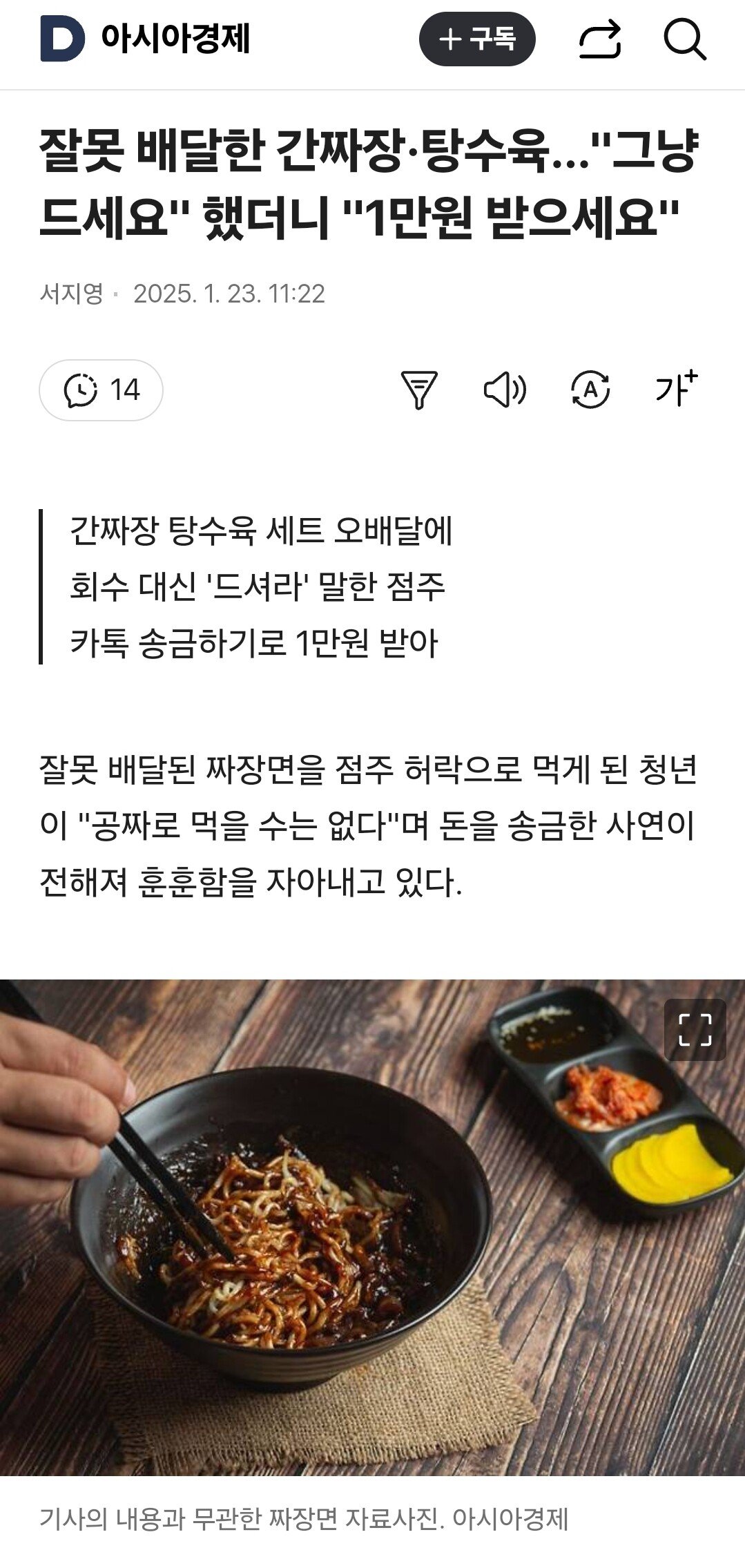 잘못 배달한 간짜장·탕수육…"그냥 드세요" 했더니 "1만원 받으세요"