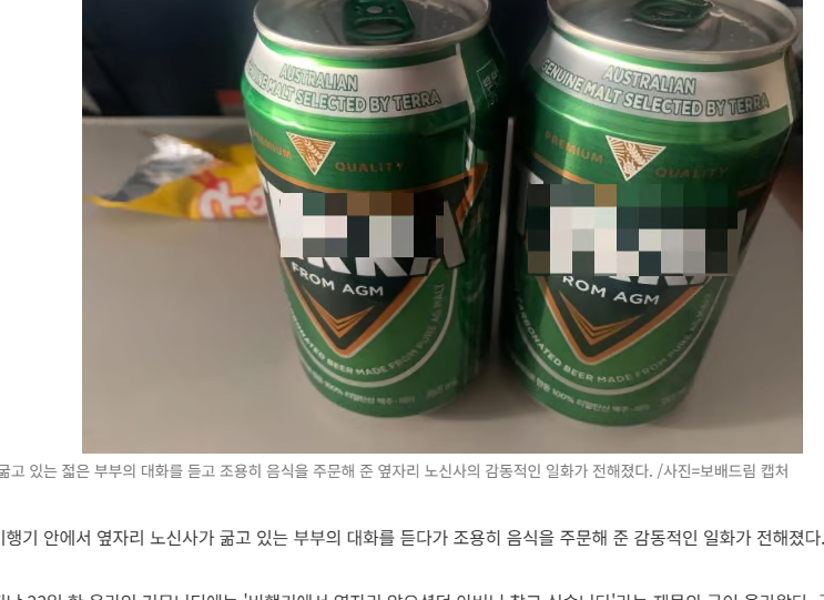 당시 국내 저가항공사를 이용한 A씨 부부는 기내 음식을 먹고 싶었으나 현지 통화로 모두 환전해 한화가 없었고 체크카드만 소지하고 있어 음식을 주문할 수 없었다. 이에 옆자리에서 승무원과 A씨 부부의 대화를 들은 어르신이 조용히 맥주 두 캔과 과자를 주문해줬다. 이후로도 부부가 배고프지 않도록 다른 음식도 사줬다.