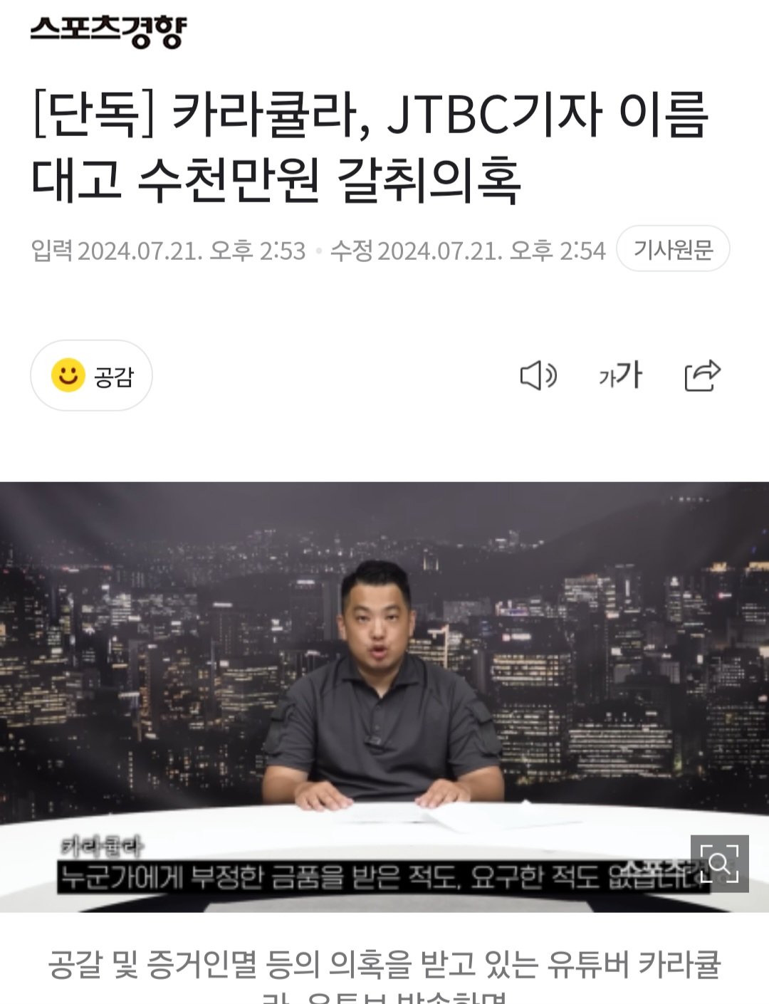 유튜버 카라큘라(이세욱)가 JTBC 모 기자를 언급하고 타 개인방송인으로부터 수천만원을 받아간 정황이 확인됐다.가로세로연구소에서 제공한 녹취에 따르면 카라큘라는 2022년 6월경 서모씨(BJ수트)에게 전화해 “지금 코인 관련해 그쪽으로 제보 들어오는 것도 많고, 이야기가 많다”며 “한 두 건도 아니고 만나서 사실관계(를 확인해야 한다)”고 말했다.또한 “나와 만나 좀 이거 얘기를 해봐야한다. 지금 여기서 사고 터지면 너 ㅇ된다. (중략) 문제된다. 이거”라며 압박을 시도했다.특히 카라큘라는 JTBC 모 기자 이름을 언급하며 재차 압박을 시도했다. 그는 “(코인 사기)관련해가지고 지금 매스컴 쪽으로도, JTBC 쪽으로도 이야기가 들어간 것이 있어 내가 지금 기자하고도 만나고 ‘컷트’치려고 내일모레 만난다”며 “모 기자라고 루나 코인 때문에 권도형 만나러 현장 취재까지 했던 여자인데, (이 기자가) 건너 건너 후배라서 만나서 이야기를 잘하려 한다. 이거 관련해 나와 내일 만나자”라고 했다.이는 서모씨가 지난 19일 언론에 공개한 옥중서신 내용과도 일치한다. 서모씨는 ‘JTBC에서 취재를 하고 있다’는 카라큘라의 압박에 의해 3000천만원을 건넸다고 했다.