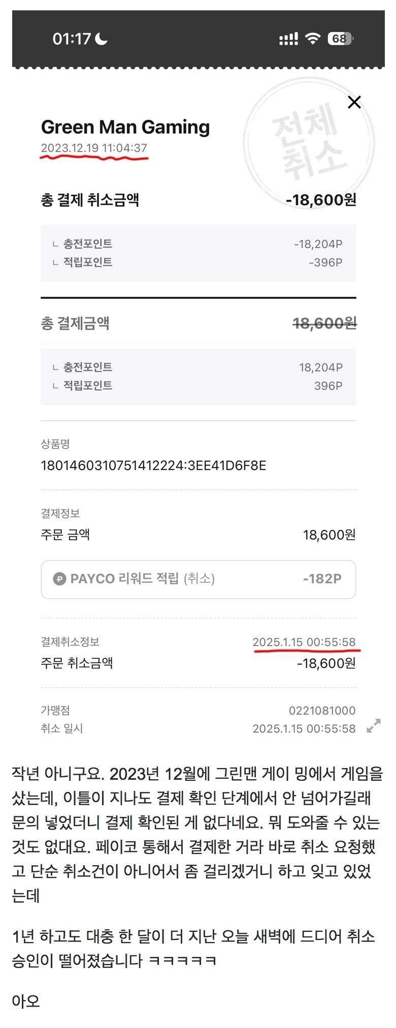 1년만에 카드결제 취소됐다는 사람 ㅎㄷㄷㄷ