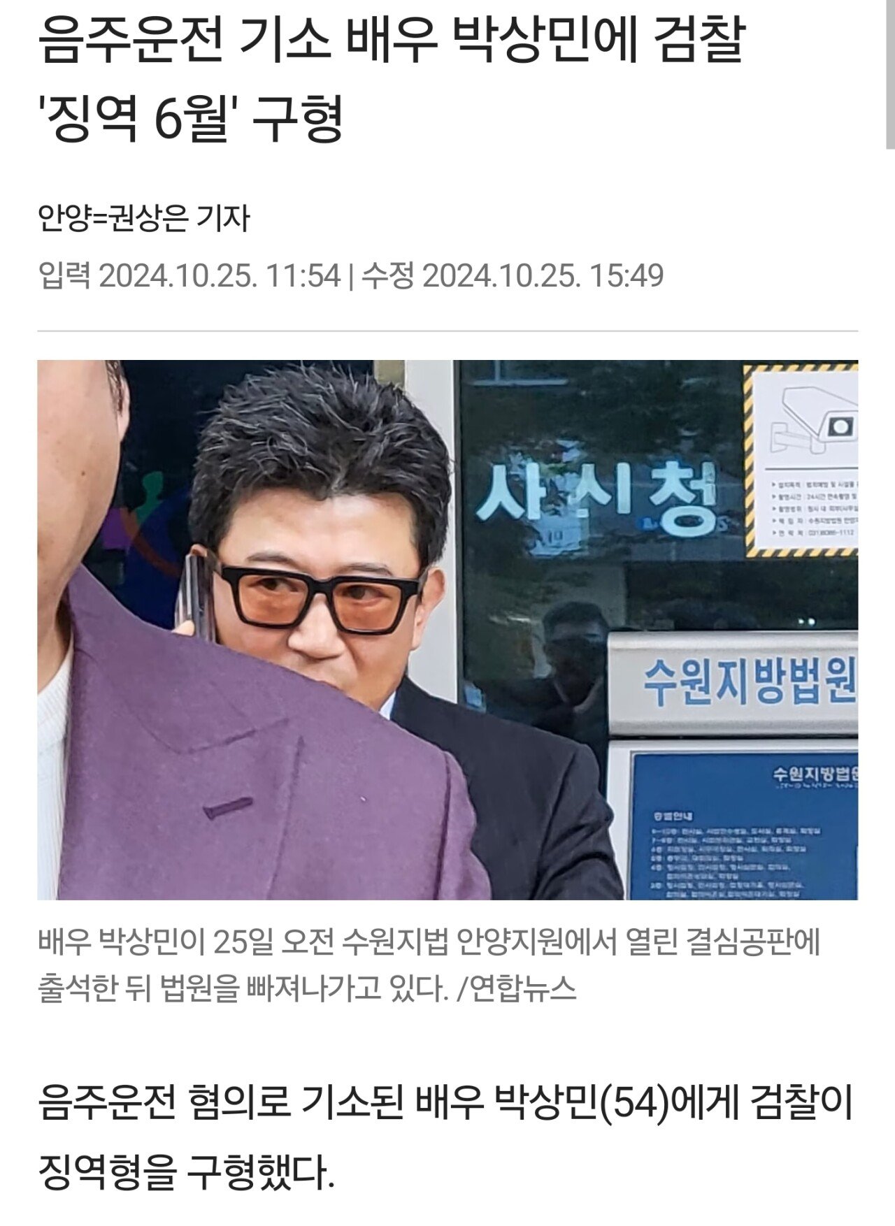 음주운전 기소 배우 박상민에 검찰 '징역 6월' 구형