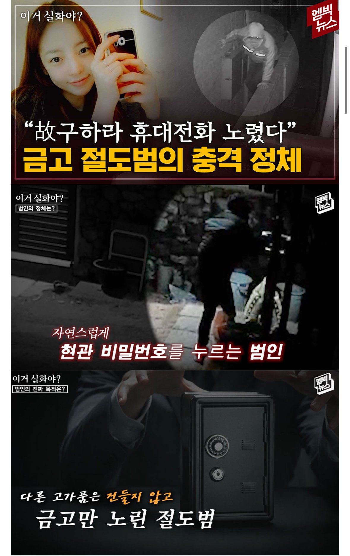 구하라 자살직후 그녀의 집에서 누군가 금고만 가지고 나왔다고 한다. 다른건 손 안 대고. 구하라가 무언가 중요한 걸 남긴걸 알고 회수하러 온거 같은데. 그녀를 아는 지인일 가능성이 높다고 하는 당시의 미스테리한 뉴스.
