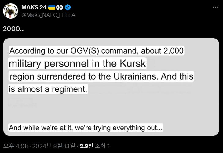 쿠르스크 방면 전선에서 현재까지 러시아군 2000명이 항복함