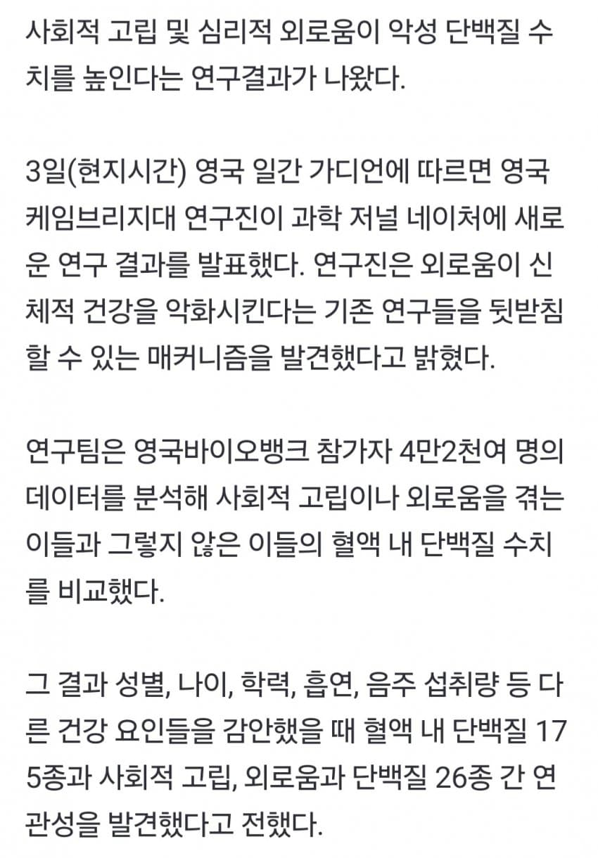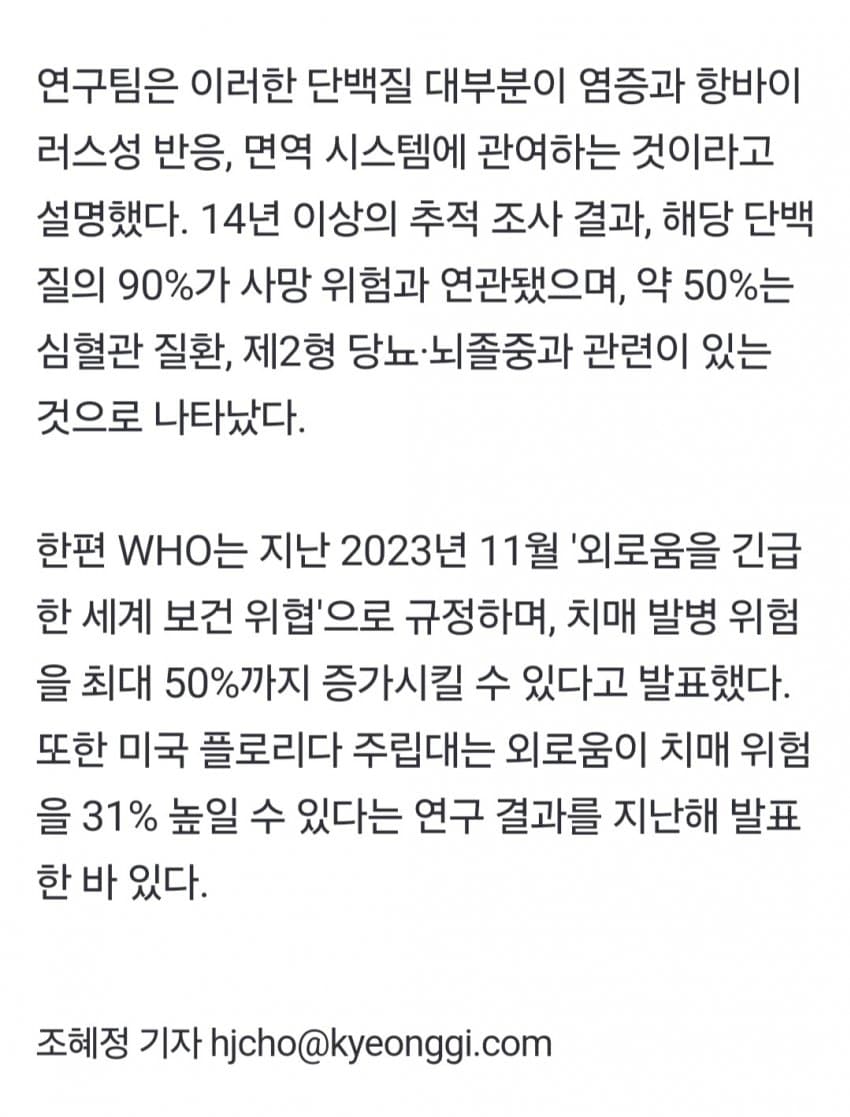 외로울수록 수명 줄어든다... '악성 단백질' 수치 높아져