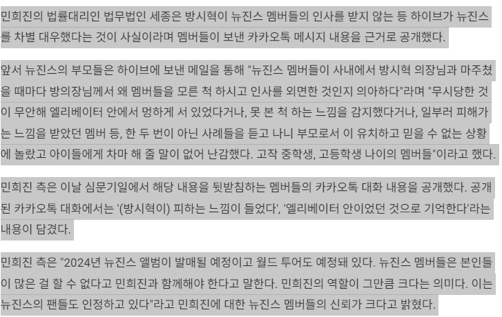 "방시혁, 인사 안받고 피해"…뉴진스 '하이브 차별대우' 호소 카톡 공개