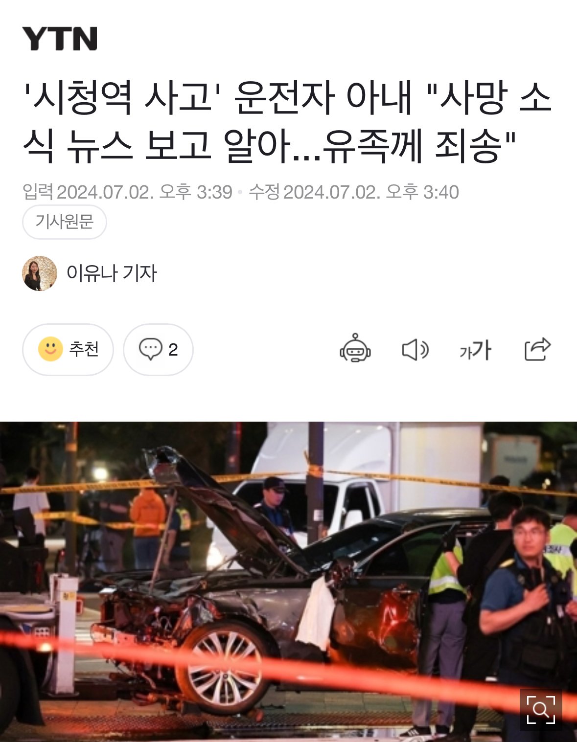 '시청역 사고' 운전자 아내 "사망 소식 뉴스 보고 알아...유족께 죄송"
