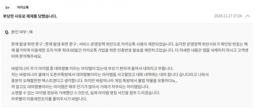 바람의나라 클래식 하다가 카톡 영구정지 먹은 사람 ㄷㄷㄷㄷ.jpg